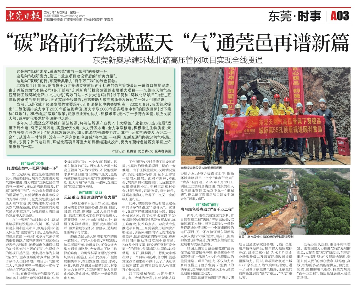 以工程機械作筆,水泥沙漿為墨,山川大地為考卷,東莞新奧人以奮進之態、攻堅之姿真抓實干,推動環城北路項目一個個“難點”“痛點”“堵點”被打通。2025年1月19日,項目正式實現全線貫通,為東莞市天然氣高壓管網工程立下又一“里程碑”,也見證了市重點項目建設中強大的“新奧力量”。